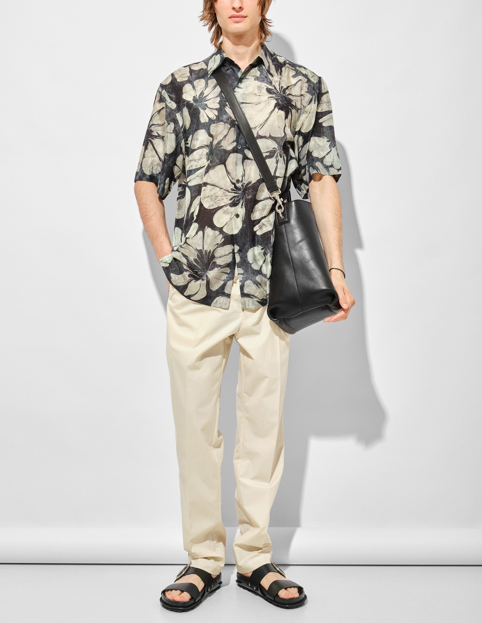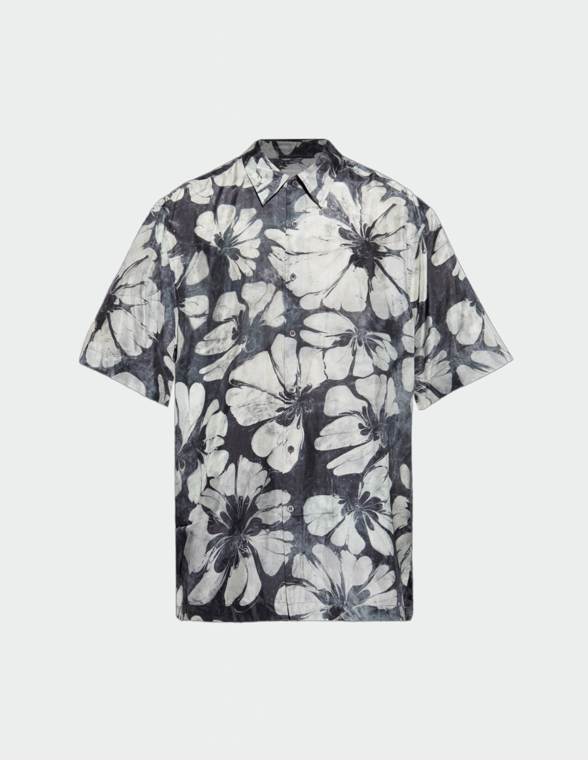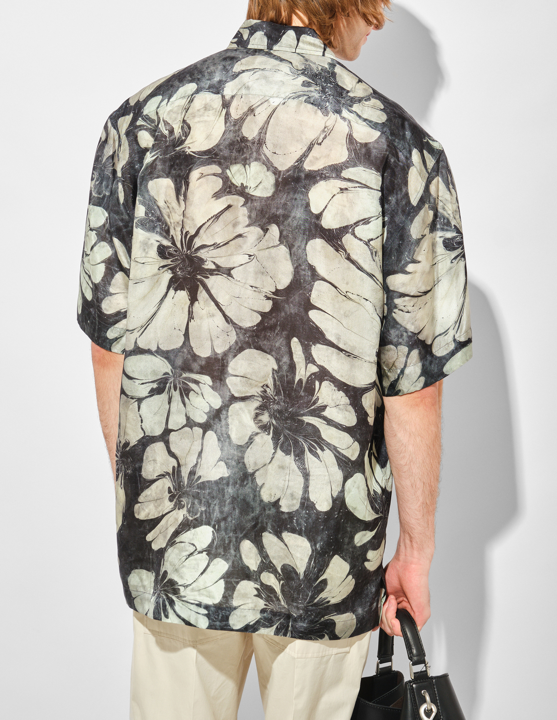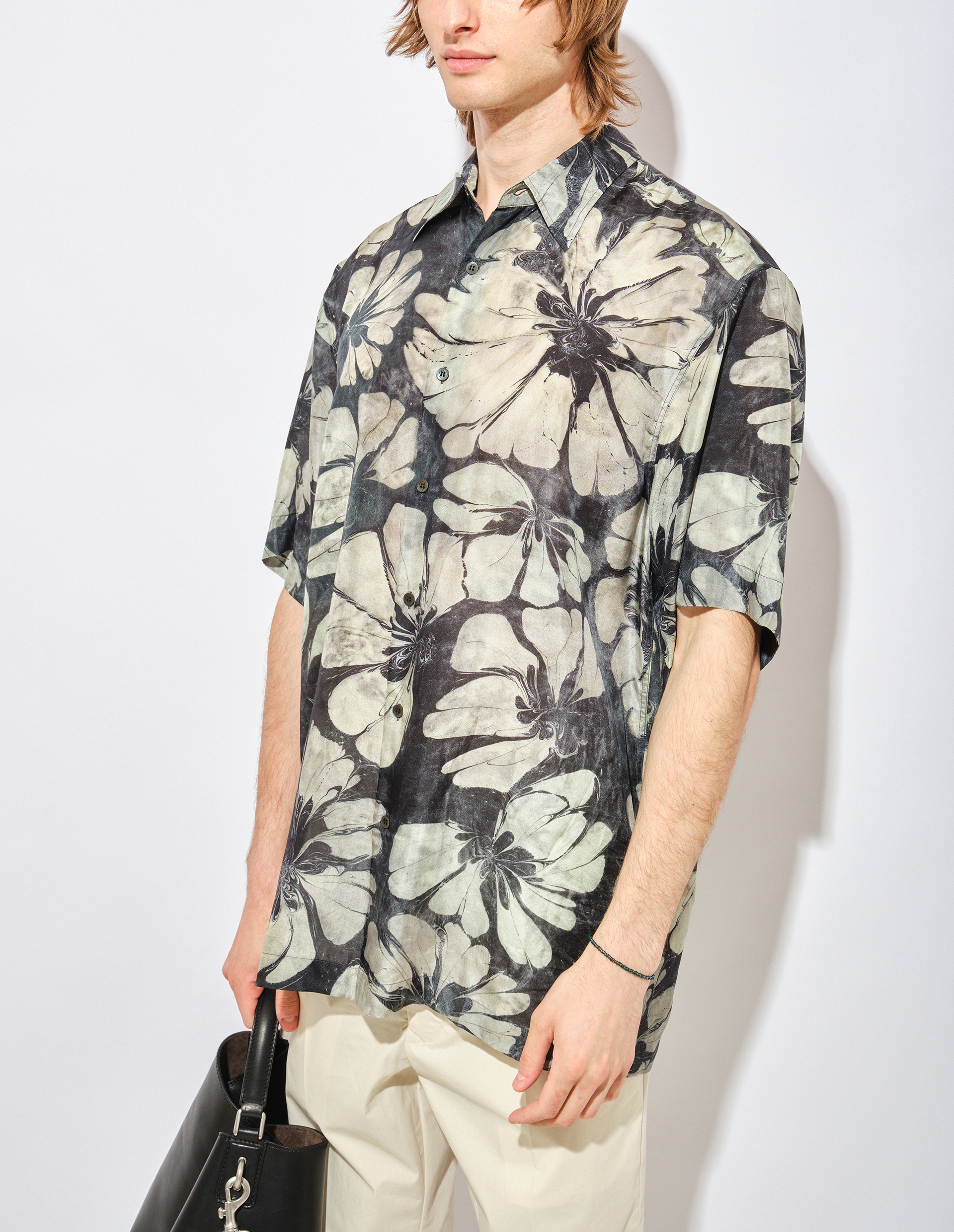 Свободный крой модели с короткими рукавами и пуговицами — современная интерпретация классики, а принт смог запечатлеть движение: цветы словно колеблются на ткани, напоминая о течении воды.