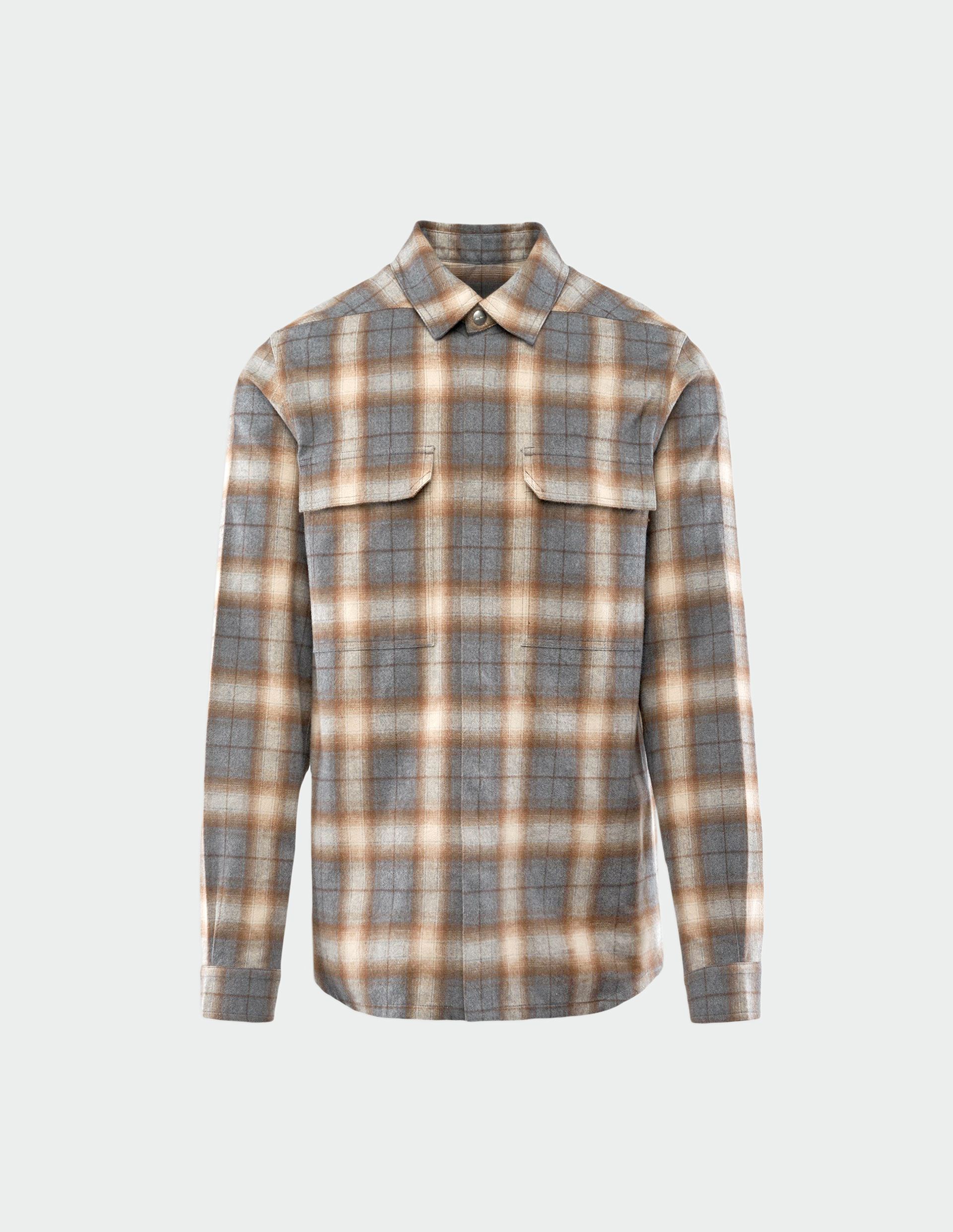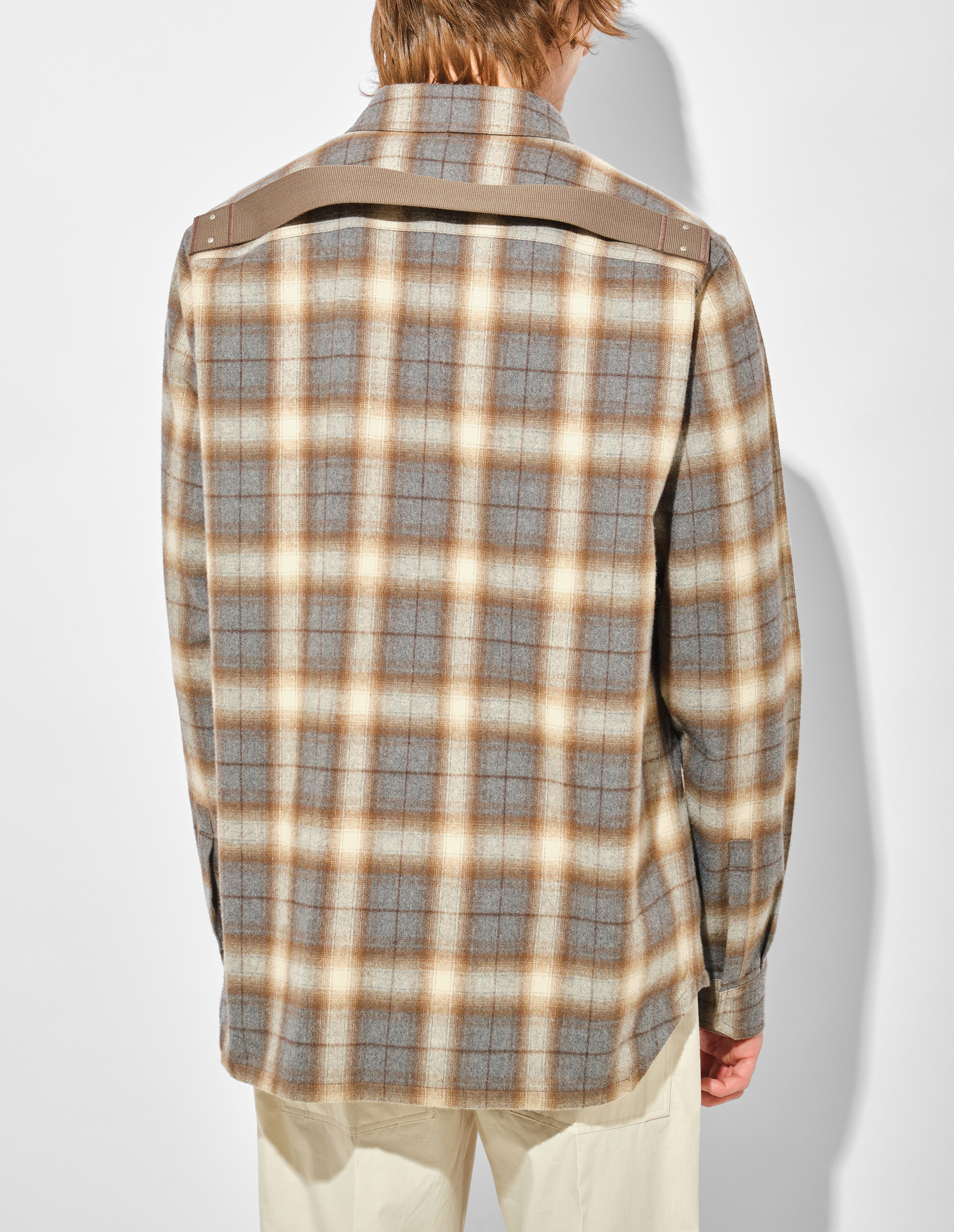 Рубашка из мягкой хлопковой фланели в расцветке GREY PLAID с характерной для Рика Оуэнса брутальной элегантностью. Ее бокси-силуэт с акцентированными швами и двойной строчкой создает архитектурную четкость форм. Застежка на скрытых кнопках, классический воротник и манжеты с кнопками дополнены фирменными деталями — скошенными карманами на груди и контрастной хлопковой стропой с заклепками на спине.