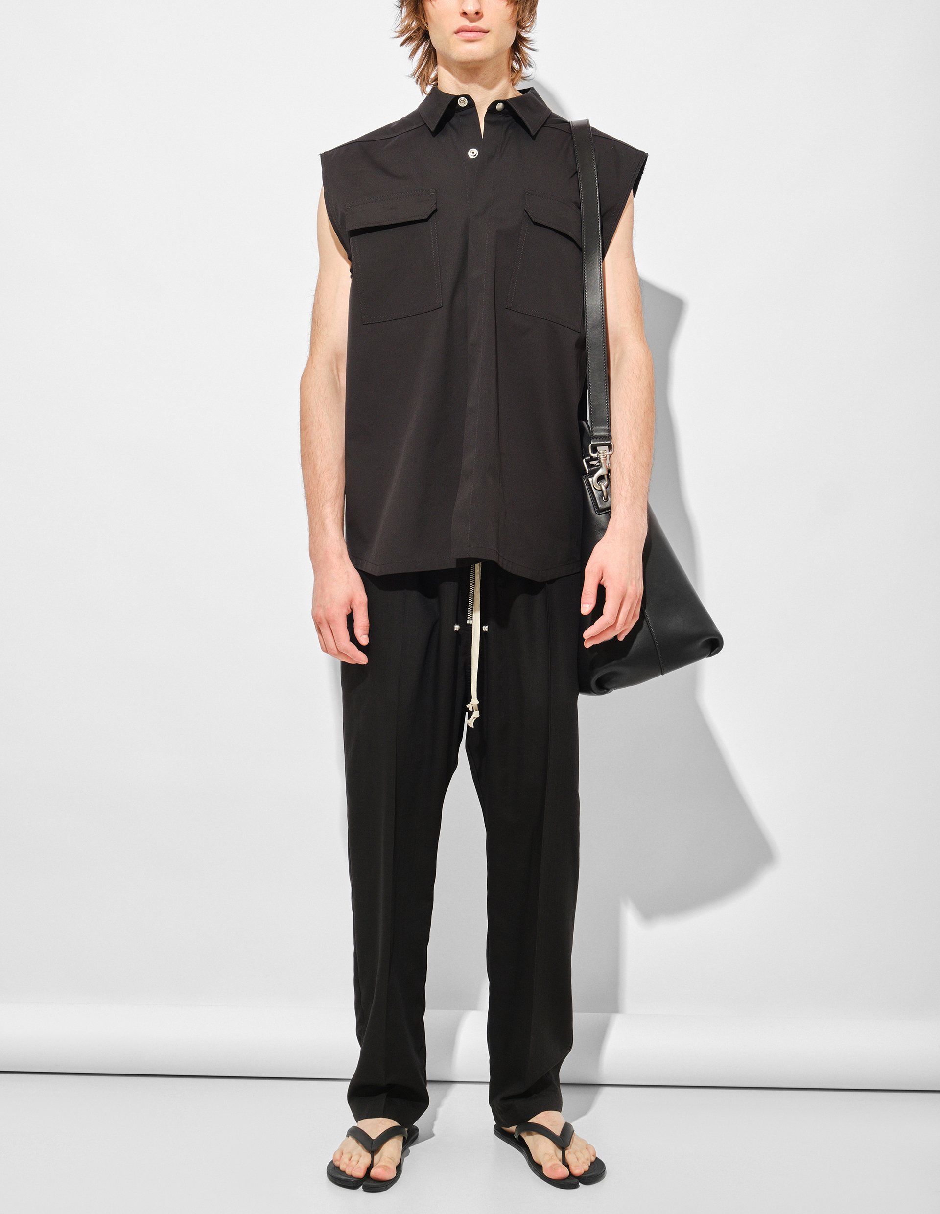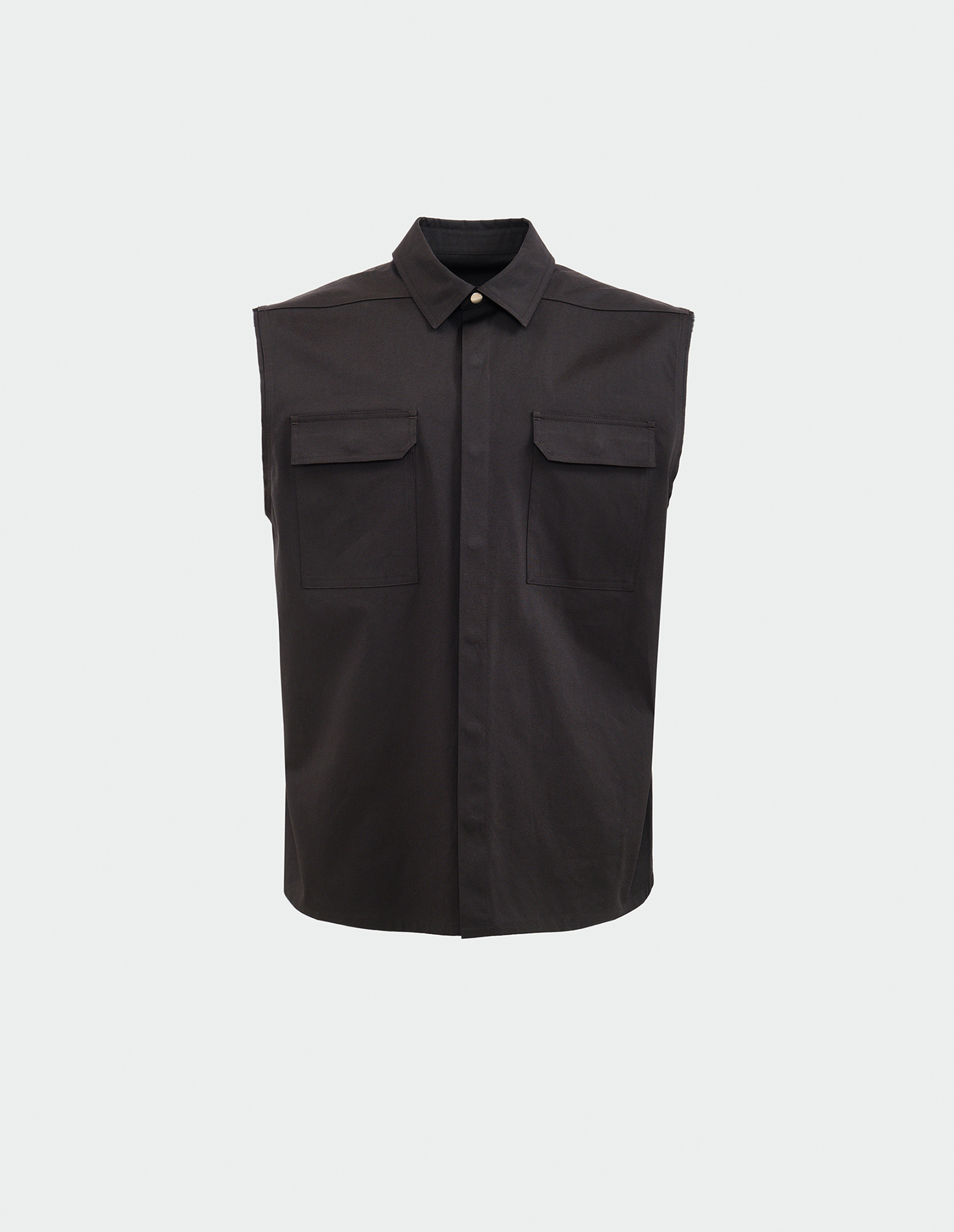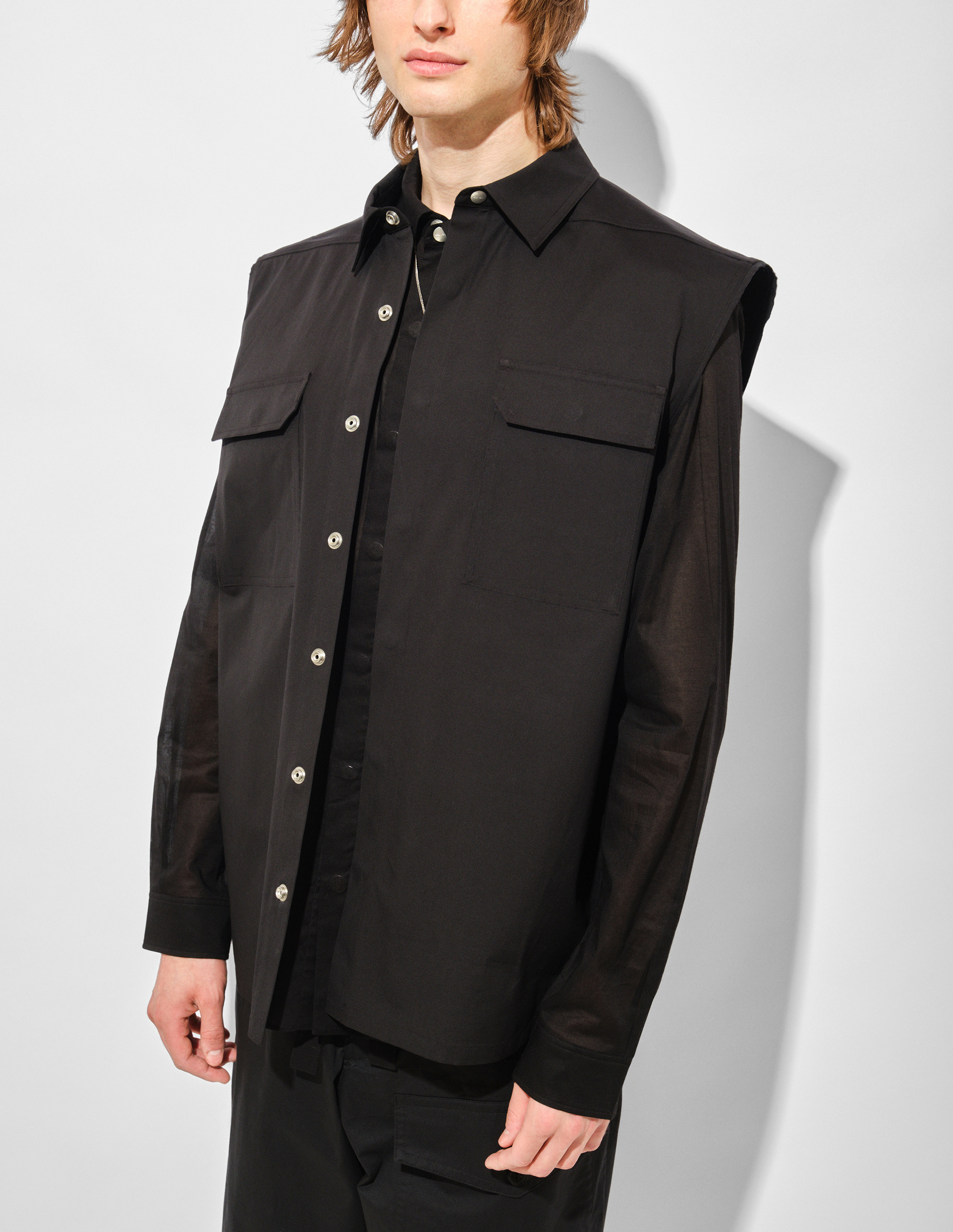 Монументальный силуэт этой рубашки без рукавов с удлиненным силуэтом — квинтэссенция постапокалиптического гламура. Созданная из тяжелого органического хлопка poplin с сертификацией GOTS, модель сочетает экологичную сознательность с фирменной брутальностью бренда. Жесткая текстура ткани с эффектом легкой потертости подчеркивает радикальный минимализм. Добавление 3% эластана обеспечивает едва уловимую подвижность, не нарушая скульптурности форм.