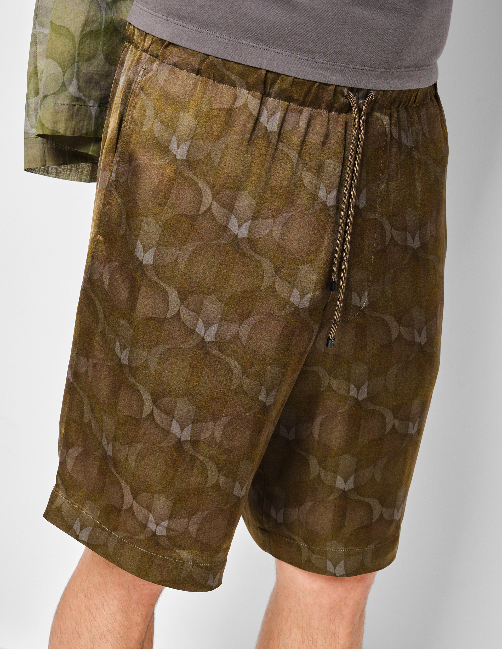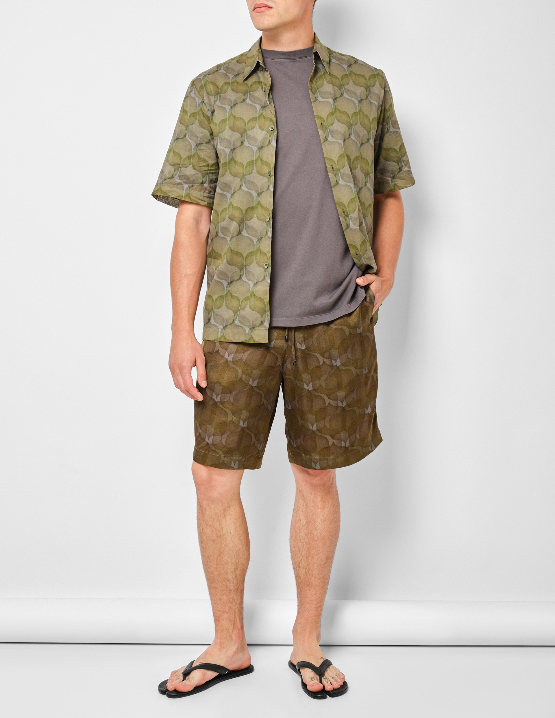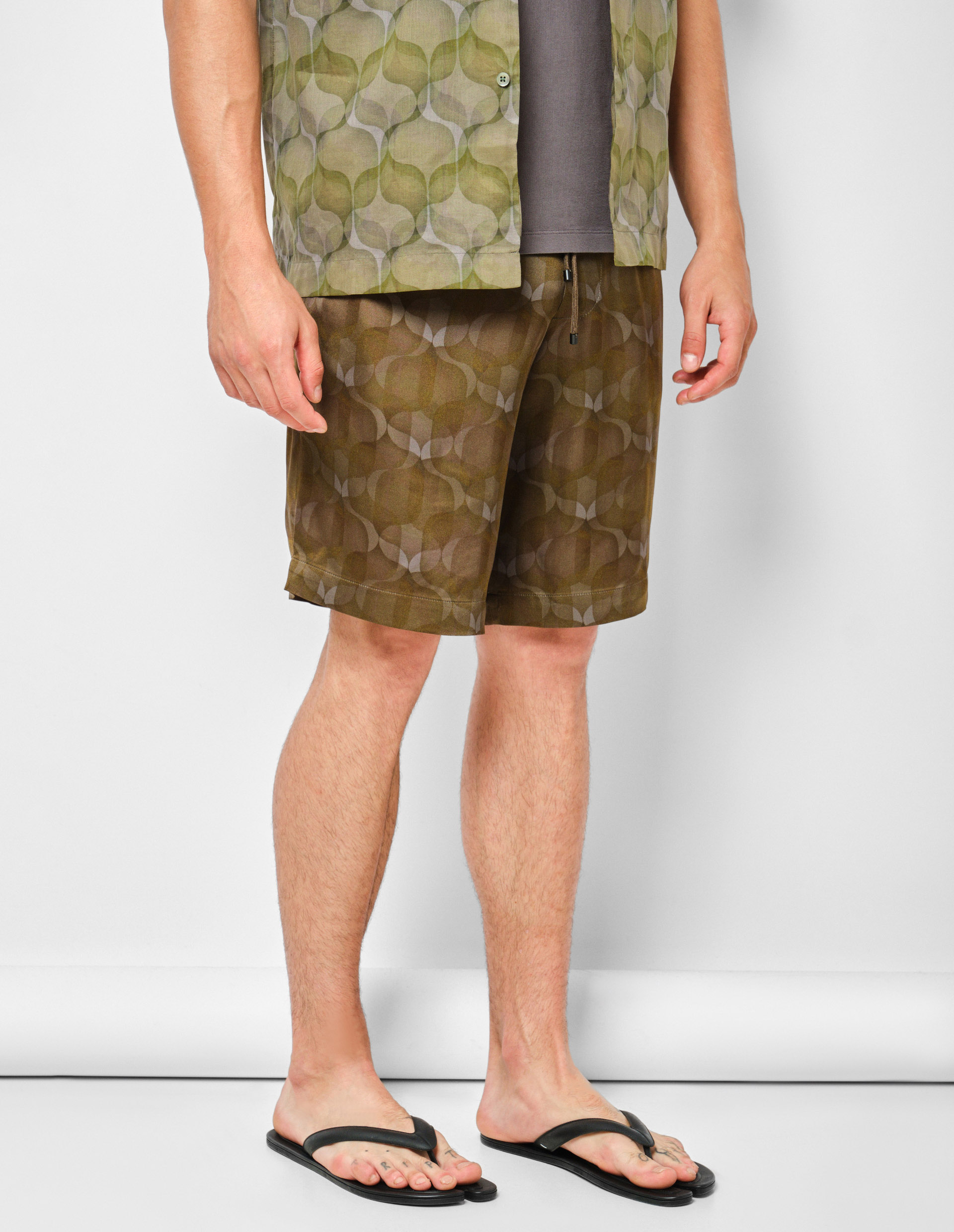Страсть к затейливым и эсклюзивным принтам подтолкнула талантливый бренд Dries Van Noten к созданию контрастного рисунка с говорящим названием «Многослойные обои 70-х годов» и выполнить его на шортах PIPERI в цвете хаки. Для наиболее красочной цветопередачи и максимального уровня комфорта был выбран струящийся и практически невесомый материал из высококачественных нитей вискозы. Изделие с тремя карманами дополнили поясом-кулиской, который можно регулировать шнуром. Создайте полный образ вместе с темно-зеленой рубашкой CLASEN с идентичным принтом от бренда Dries Van Noten.