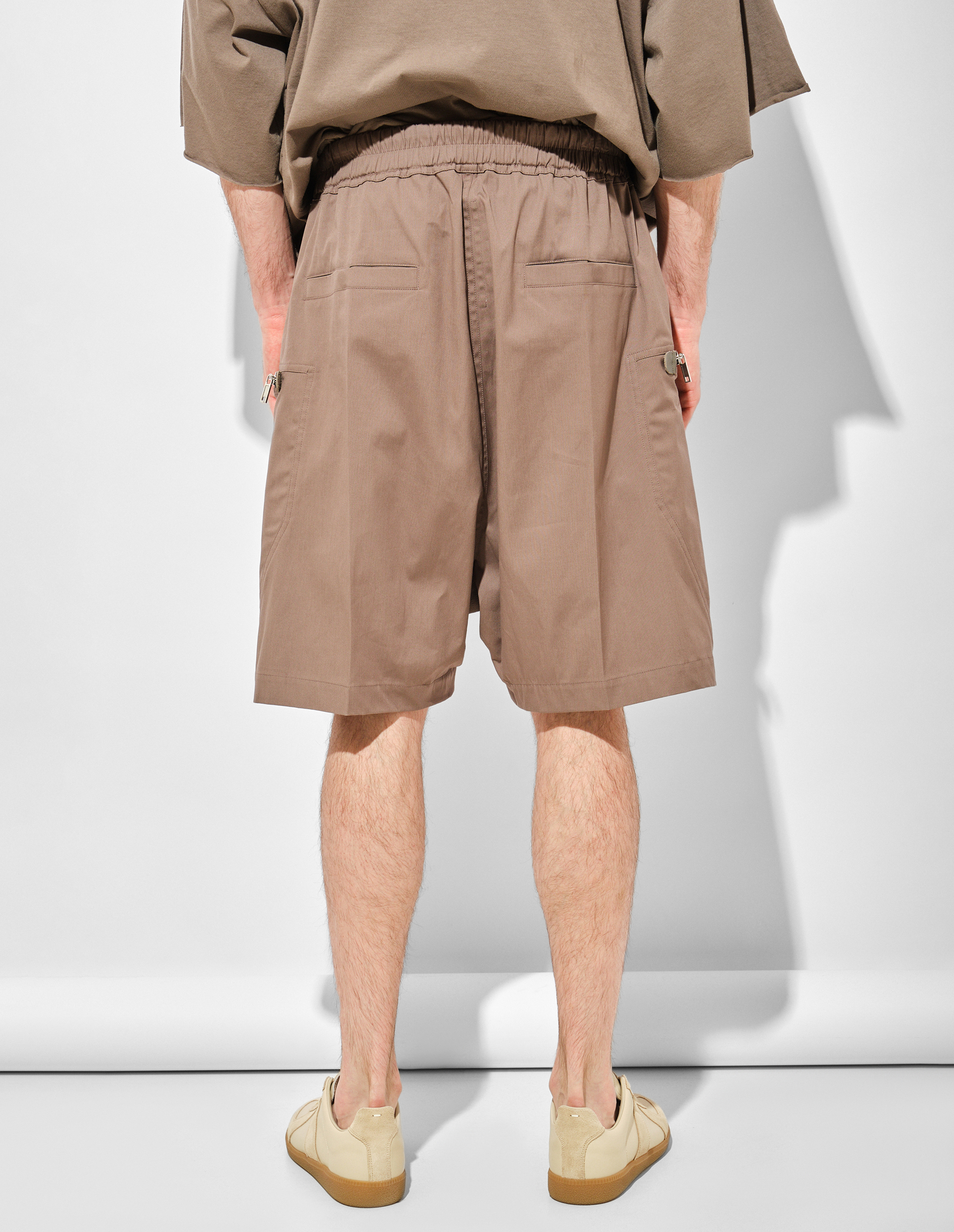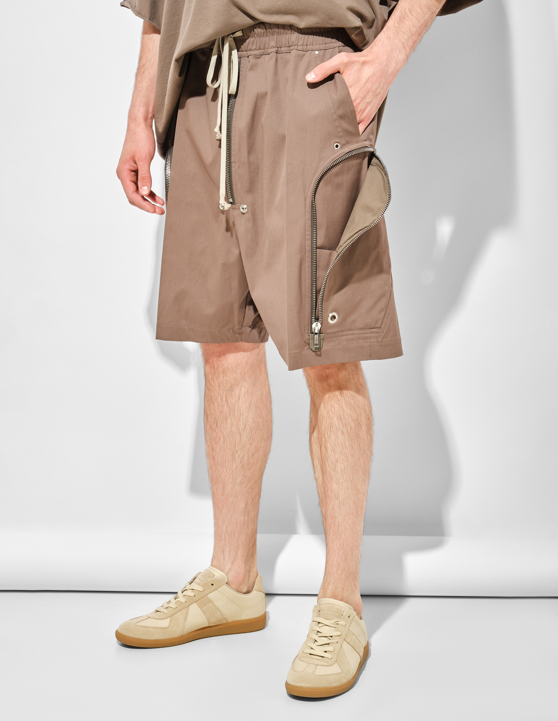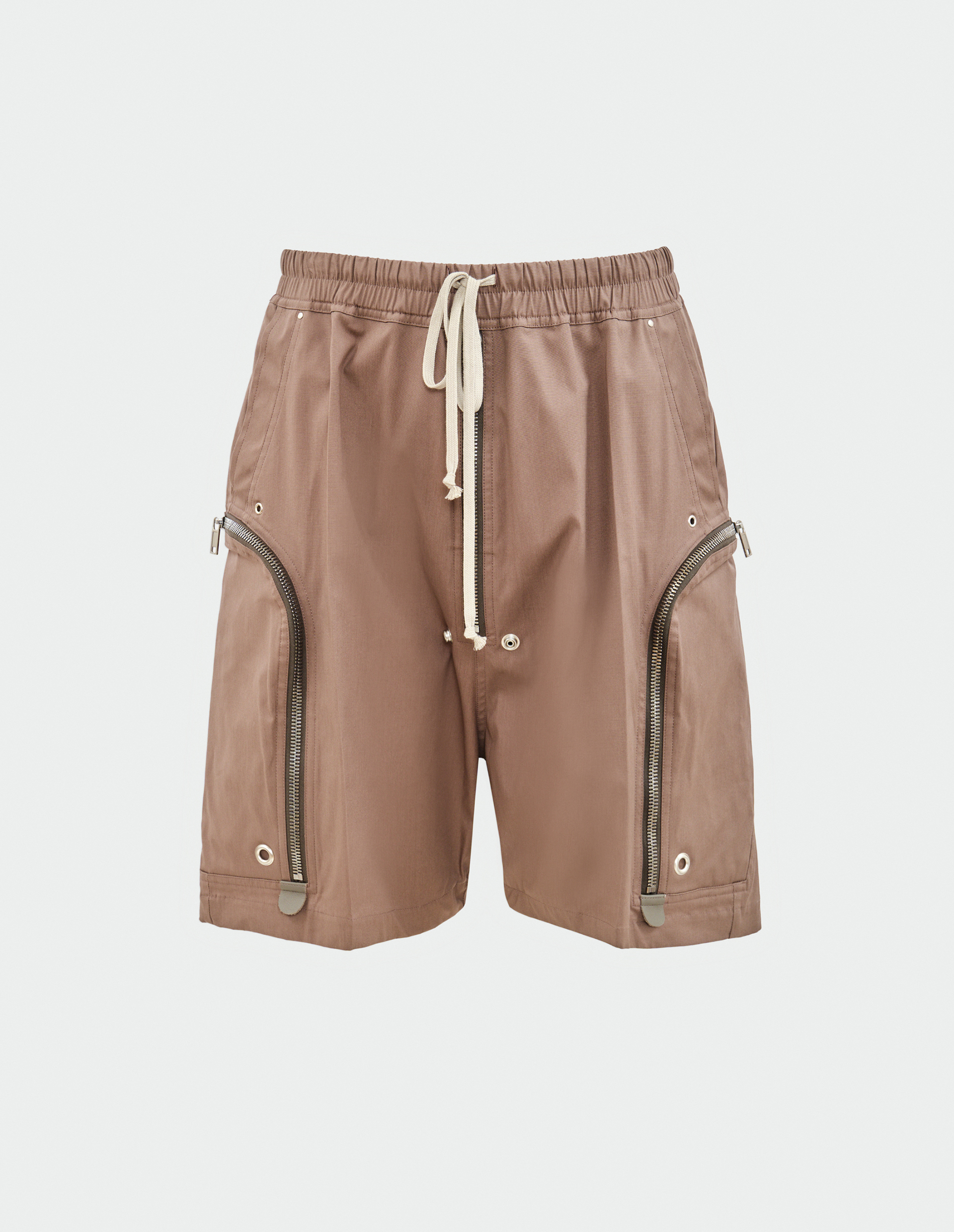 Бермуды Bela от RICK OWENS длиной до колена с эластичным поясом и кулиской выполнены из тонкой 100% шерсти. Их силуэт с низким шаговым швом подчеркивает характерный для бренда авангардный крой, а открытая центральная zip-застежка, заклепки и функциональные карманы BAUHAUS на молнии добавляют индустриальную жесткость, сохраняя при этом лаконичную эстетику бренда.