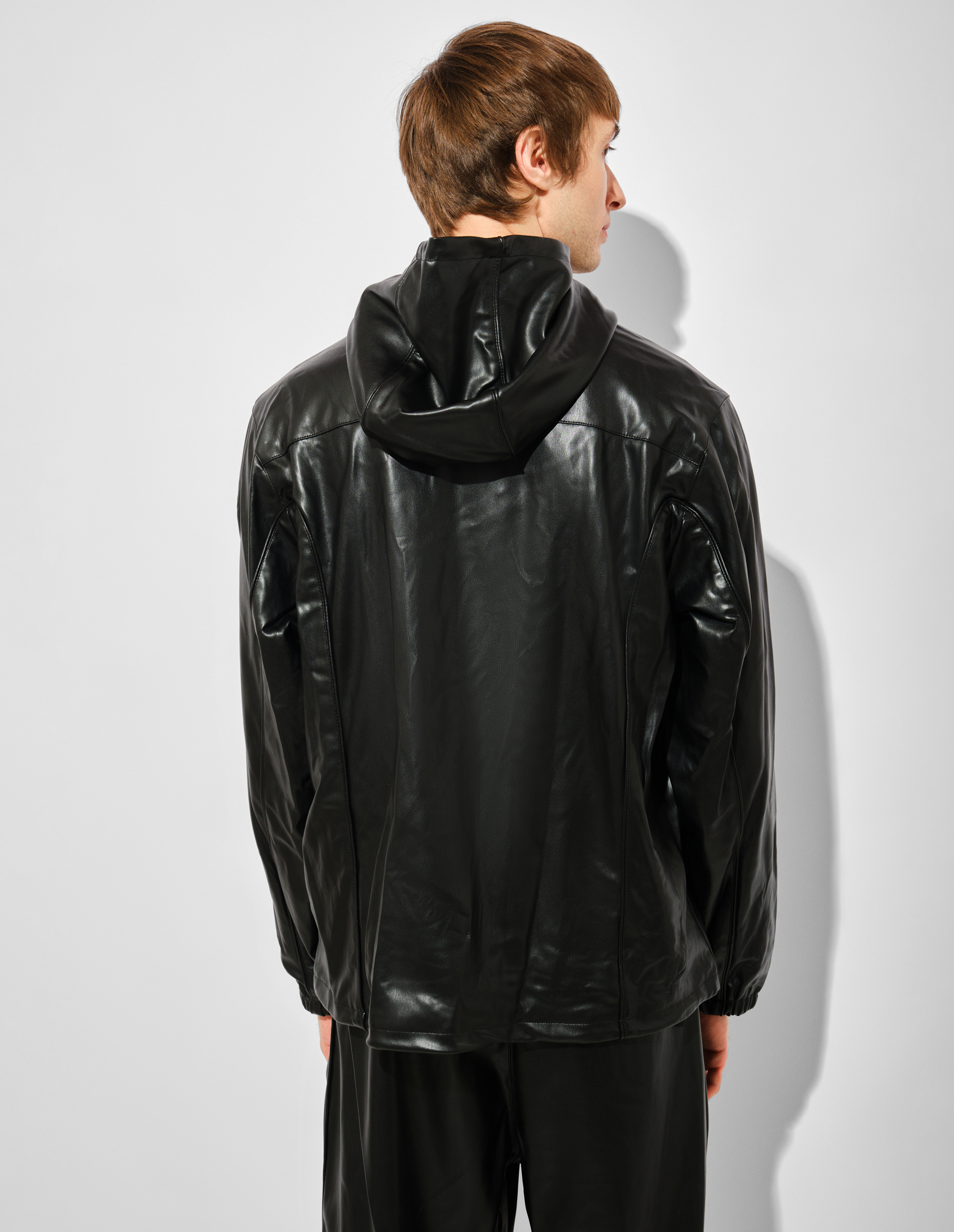 Куртка-ветровка из черной глянцевой эко-кожи с капюшоном