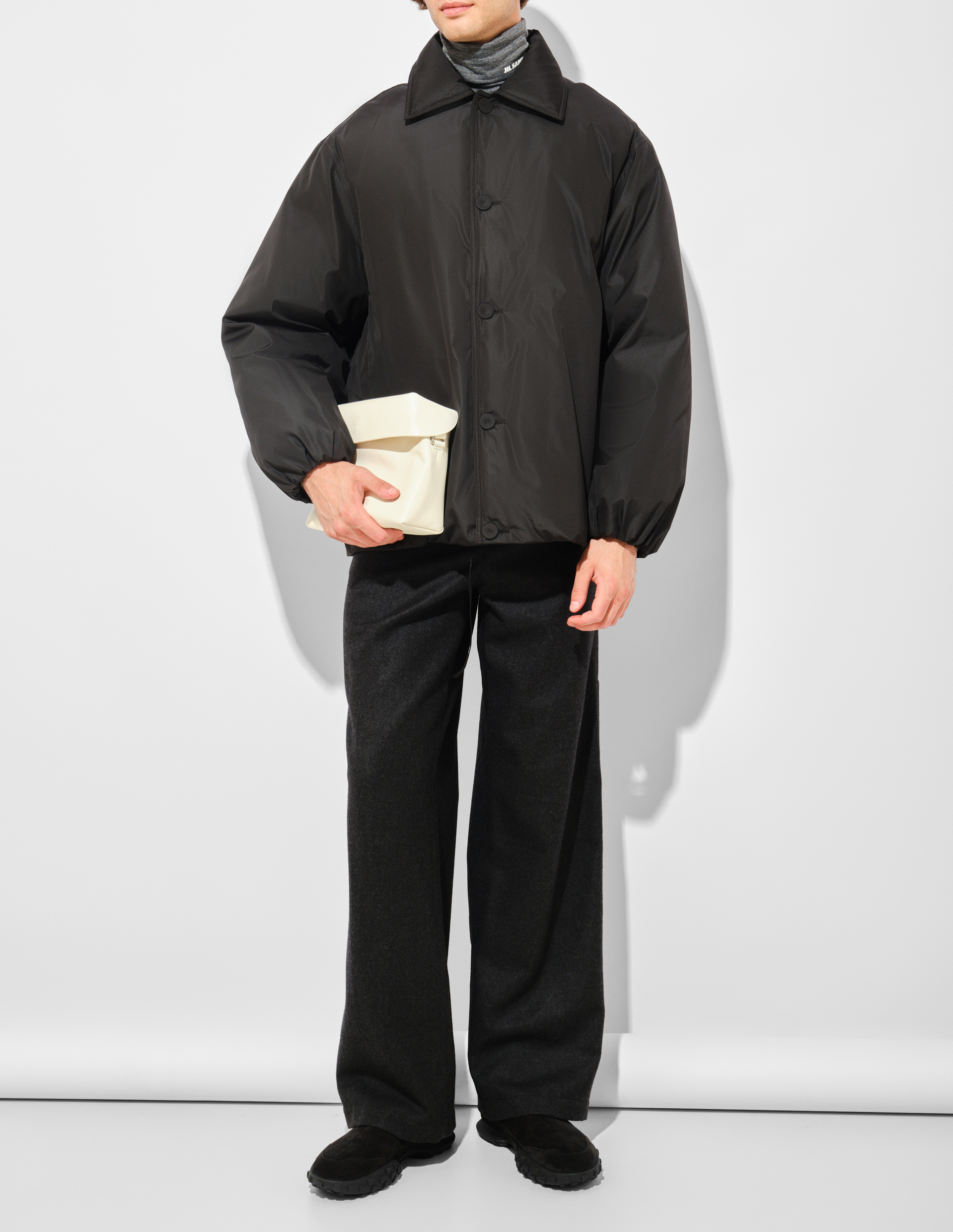 Минималистичное утепленное пальто из переработанного нейлона для сезона FW25-26 воплощает экологичную эстетику Jil Sander, где ответственность встречается с безупречным дизайном. Обычная посадка с акцентом на чистоту линий подчеркивает архитектурный подход бренда, а плоский заостренный воротник добавляет строгости силуэту.