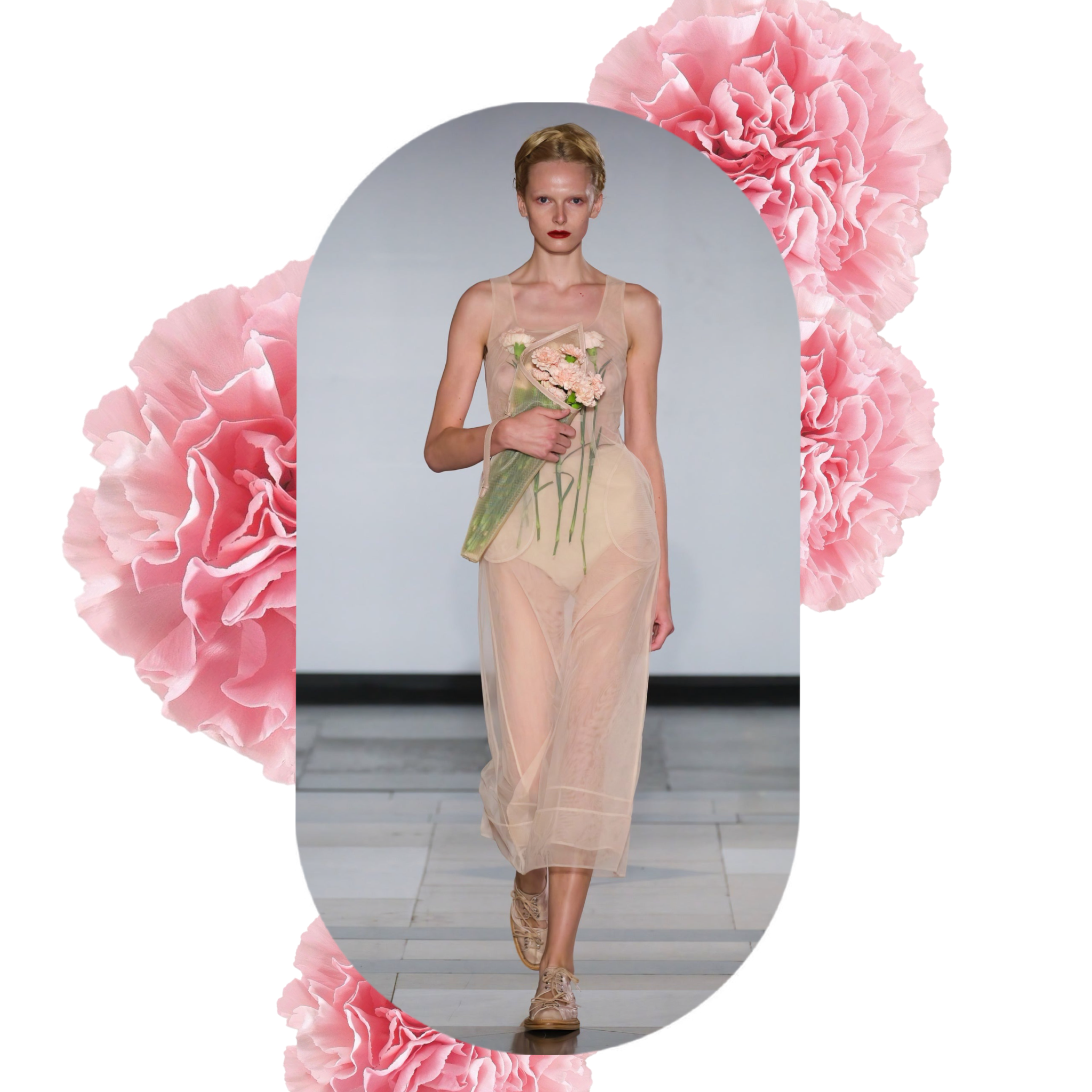Коллекция Симон Роша стала тонко сплетённым дуэтом между притягательностью и неизбежностью. Она исследовала то, к чему мы стремимся (но не можем автоматически обладать), и то, что нам хотелось бы избегать (но что неизбежно касается каждого). Это был финал трилогии показов. Коллекция прошлого сезона в Лондоне носила название The Dress Rehearsal («Генеральная репетиция») и была задумана как прелюдия к её кутюрному сотрудничеству с Жан-Полем Готье, что выражалось через мотивы роз, вплетённые в наряды. Центр этого цикла в Париже был озаглавлен The Procession («Процессия») и символизировал их творческое объединение. А финал получил название The Wake («Поминки»), завершая этот изысканный роман.